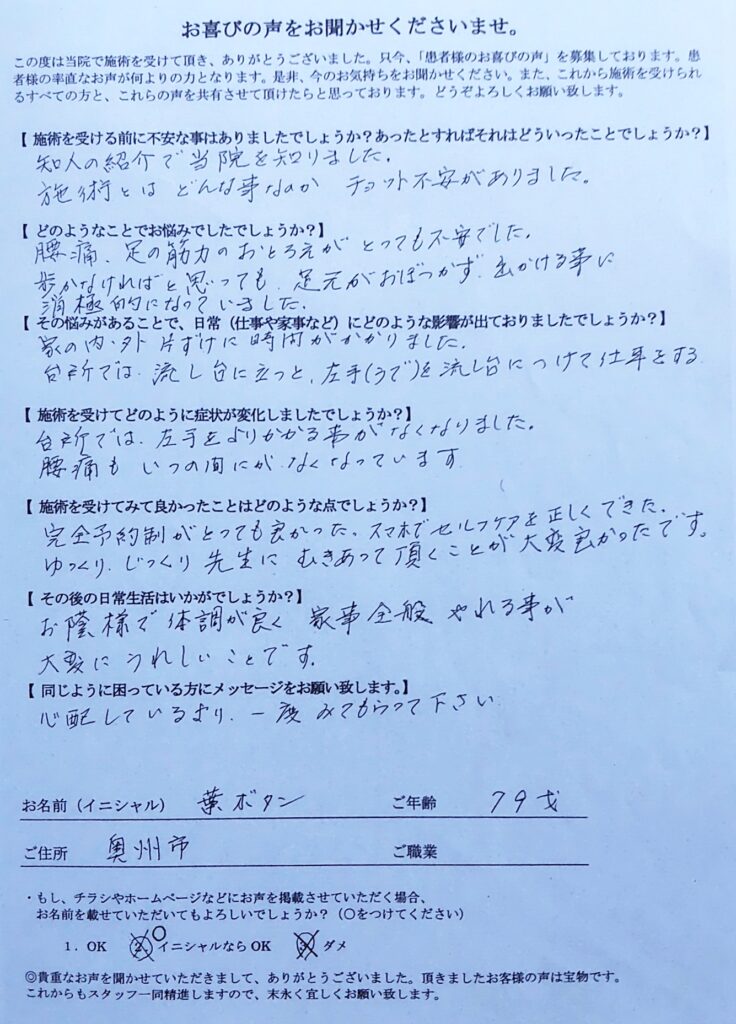 完全予約制がとっても良かった。スマホでセルフケアを正しくできた。ゆっくり、じっくり先生にむきあって頂くことが大変よかったです。
