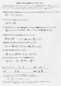 突然右殿部の筋肉をつかまれ、ちぎられるような強い痛みと腰痛に襲われ、夜も眠れず寝返りもできませんでした。その後整形外科で「すべり症」と診断され、このままでは歩くことも立っていることも寝ていることも辛く、この痛みを抑えたいと思いました。