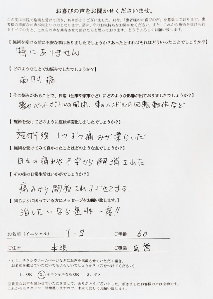 痛みが減り、日常に支障をきたすことは無くなりました。