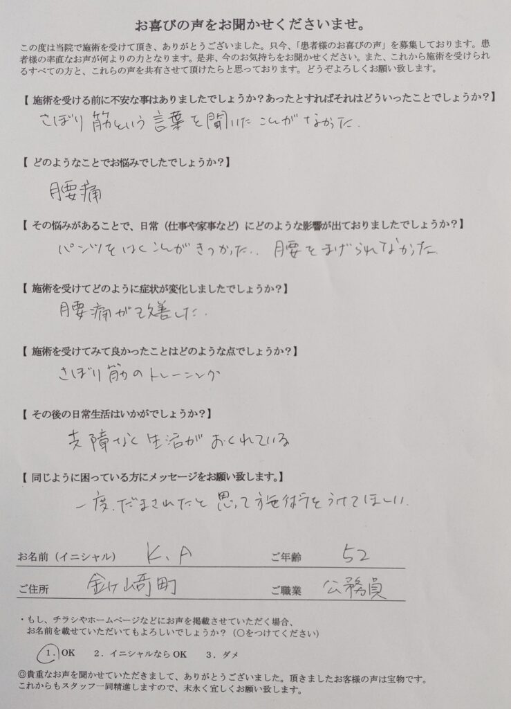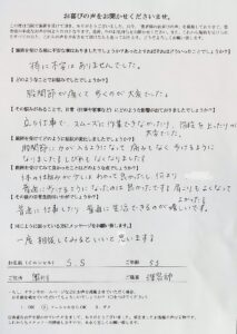 驚いたことに初回の施術で腰の痛みが無くなり、数回の施術・セルフケアで腰の痛みが劇的に解消しましたし、長年の悩みであり、念願であった正座・あぐらも長時間できるようになりました。