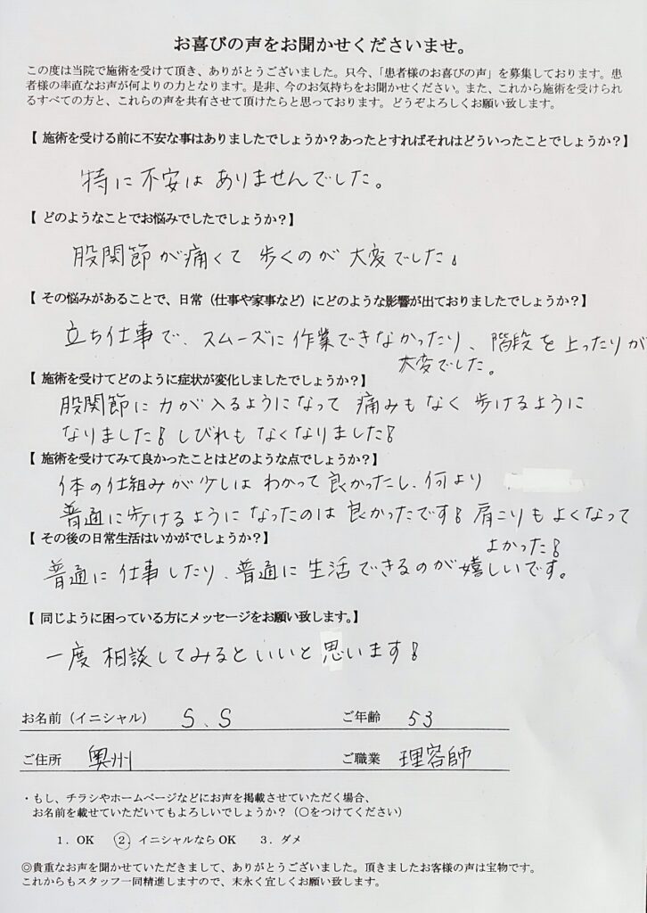 股関節に力が入るようになって痛みもなく歩けるようになりました!しびれもなくなりました!
