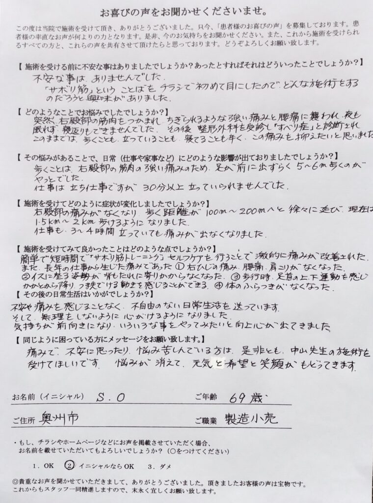 右殿部の痛みがなくなり、歩く距離が100m~200mへと徐々に延び、現在は1.5km~2km歩けるようになりました。仕事も3~4時間立っていても痛みが出なくなりました。